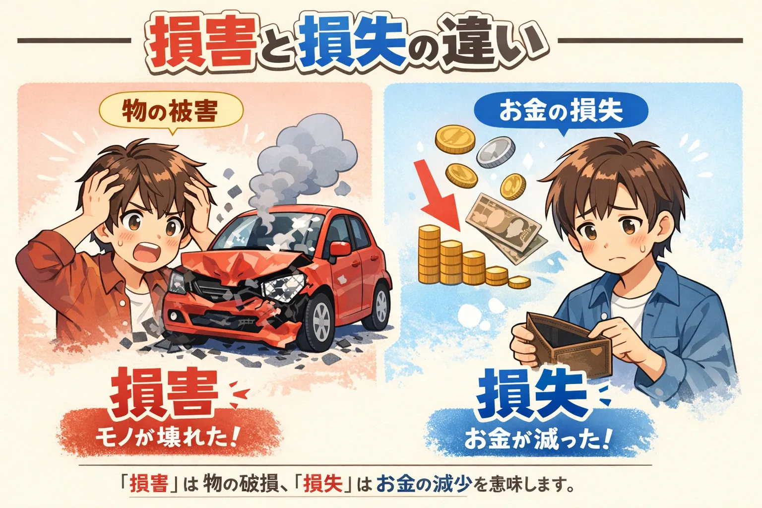 保険の世界では、ちょっとした言葉の違いが大きな意味を持つことがあります🌟!例えば、「損害」と「損失」。一見似ているようで、実は異なるニュアンスがあります。 例えばお仕事用のトラックが事故を起こしたとします。損害はトラックそのものの破損や運転手のケガを指し、損失はその影響で失われた利益や修理費用のことを指します🔍。 皆さまが何をカバーすべきか、分かりやすくお伝えするのも私たちの役目です✨。 いつでもお気軽に相談してくださいね!当社ではお客様の立場に立ち、最適な保険プランをご提案いたします😊。